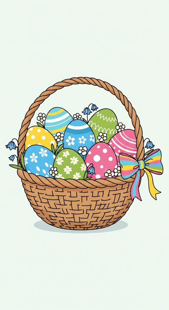 The basket can be illustrated using a woven texture and decorated with ribbons, flowers, or bows. Eggs inside the basket can be brightly colored or patterned to create visual interest.