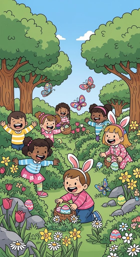 This design might include children searching for eggs in a garden, eggs hidden in the grass, and baskets ready to collect them. Trees, flowers, and butterflies can be added to create a lively outdoor setting.