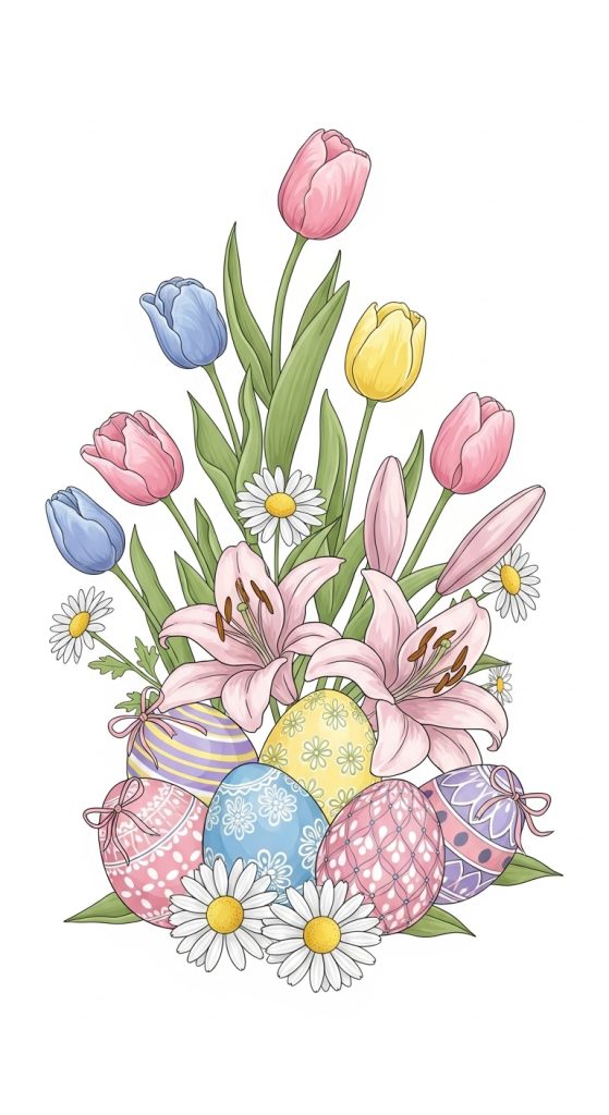Spring flowers are closely tied to Easter because the holiday celebrates renewal and new beginnings. Combining flowers with decorated eggs creates a soft and elegant clipart style.