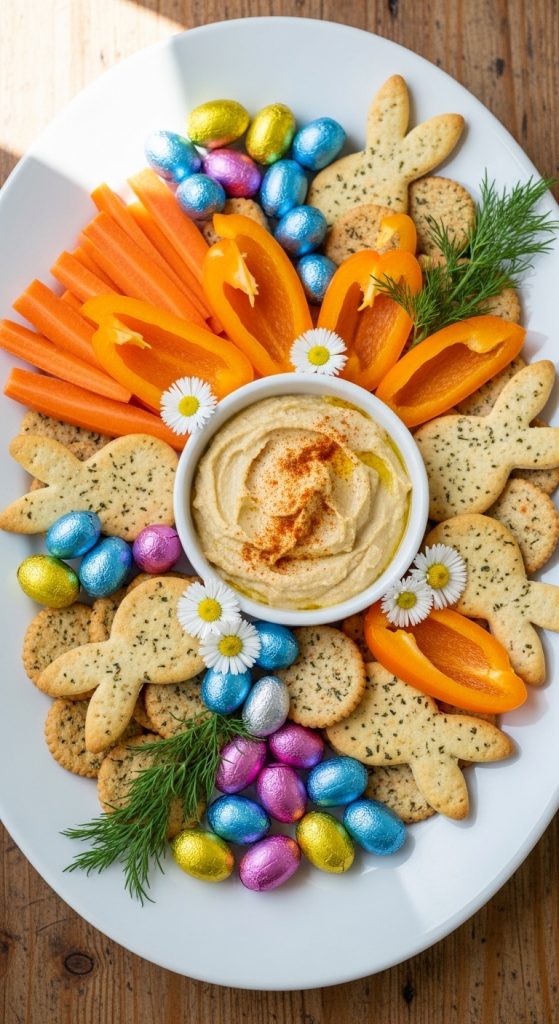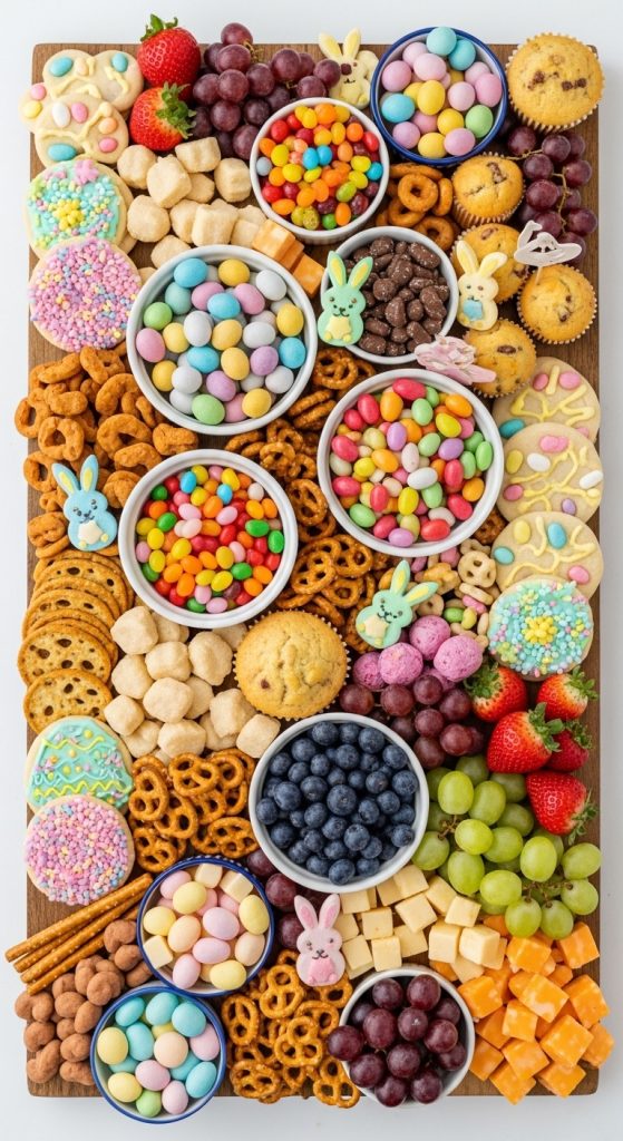 Bunnies are the ultimate Easter symbol, and a bunny-themed board can bring whimsy and charm to your table. Use a bunny-shaped serving platter or create bunny silhouettes with cheese slices or crackers. Incorporate carrot sticks, orange bell pepper slices, and hummus for a playful touch. Round out the board with pastel candies, chocolate eggs, and a small dish of almond or hazelnut spreads to complete the bunny-friendly feast.