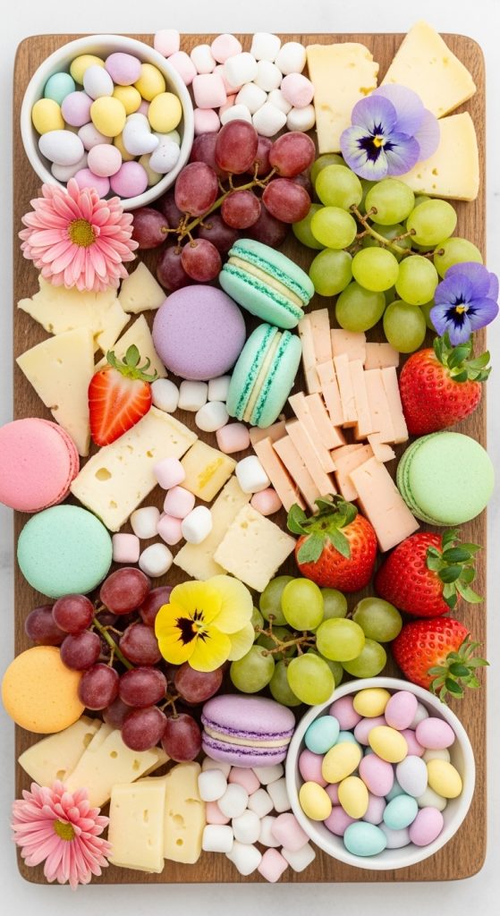 The pastel spring board is all about soft, soothing colors reminiscent of Easter eggs. Think pale pinks, lavender, mint green, and soft yellows. Include pastel-hued cheeses like gouda or havarti, complemented by fresh fruits such as strawberries, green grapes, and kiwi slices. Add delicate pastel macarons or white chocolate truffles to enhance the aesthetic. A few sprigs of edible flowers like pansies or violets make this board truly Instagram-worthy.
