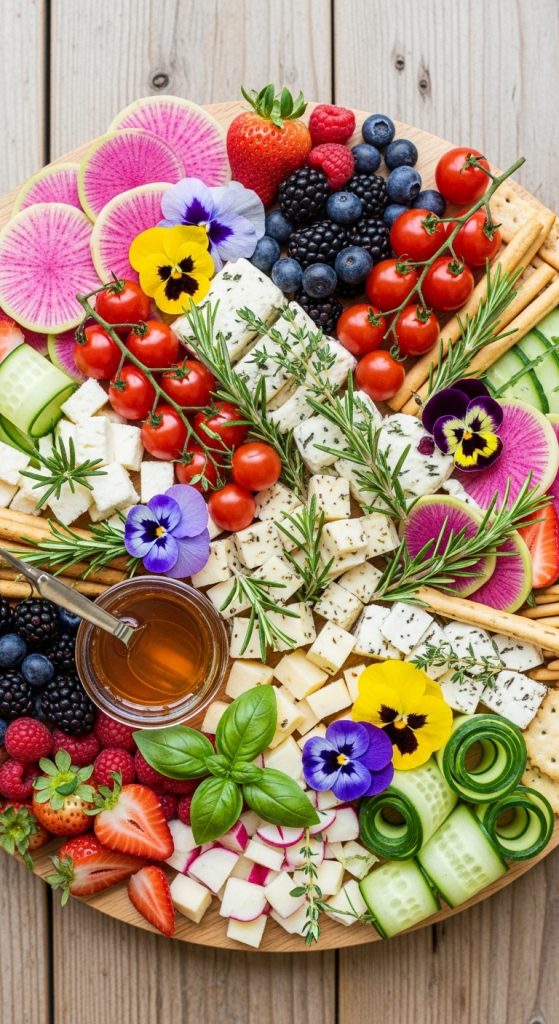 Nothing says spring like fresh flowers, and a floral garden charcuterie board combines beauty with flavor. Use edible flowers such as nasturtiums, marigolds, or pansies to garnish the board. Include fresh vegetables like radishes, cherry tomatoes, and cucumbers, alongside herb-infused cheeses. Pair with light crackers and fresh berries for a garden-fresh feel. You can even add a small jar of honey to drizzle over cheeses for a sweet finish.