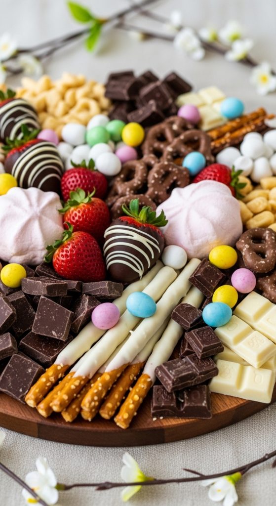For those with a sweet tooth, a chocolate-themed Easter charcuterie board is a dream come true. Include dark, milk, and white chocolate pieces alongside chocolate-covered strawberries and marshmallows. Add chocolate-dipped pretzels for crunch and pastel-colored chocolate eggs for festive flair. Pair with fruits like bananas and raspberries, as the slight tartness balances the rich chocolate flavors perfectly.