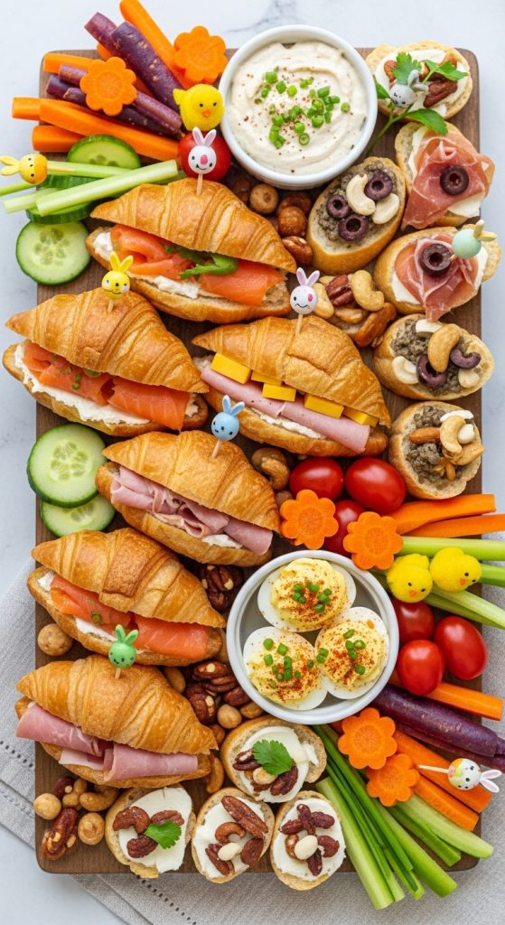 Mini sandwiches on a charcuterie board are fun, filling, and perfect for Easter brunch. Create bite-sized sandwiches using croissants, slider buns, or fresh baguette slices. Fill them with a variety of ingredients, from classic ham and cheese to smoked salmon and cream cheese with dill. Arrange them creatively with fresh veggies and small dips on the board. Adding a few Easter-themed picks, like tiny eggs or bunny toppers, adds a festive flair.