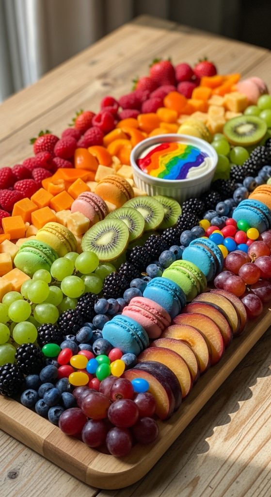 Colorful and cheerful, a rainbow-themed charcuterie board captures the joy of Easter. Arrange fruits, vegetables, cheeses, and candies by color to create a rainbow effect. Red strawberries, orange bell peppers, yellow cheese cubes, green grapes, blueberries, and purple plums can be visually striking. Finish the board with multicolored candies or macarons to tie the theme together. This type of board is especially appealing to kids and adds an element of fun to your gathering.
