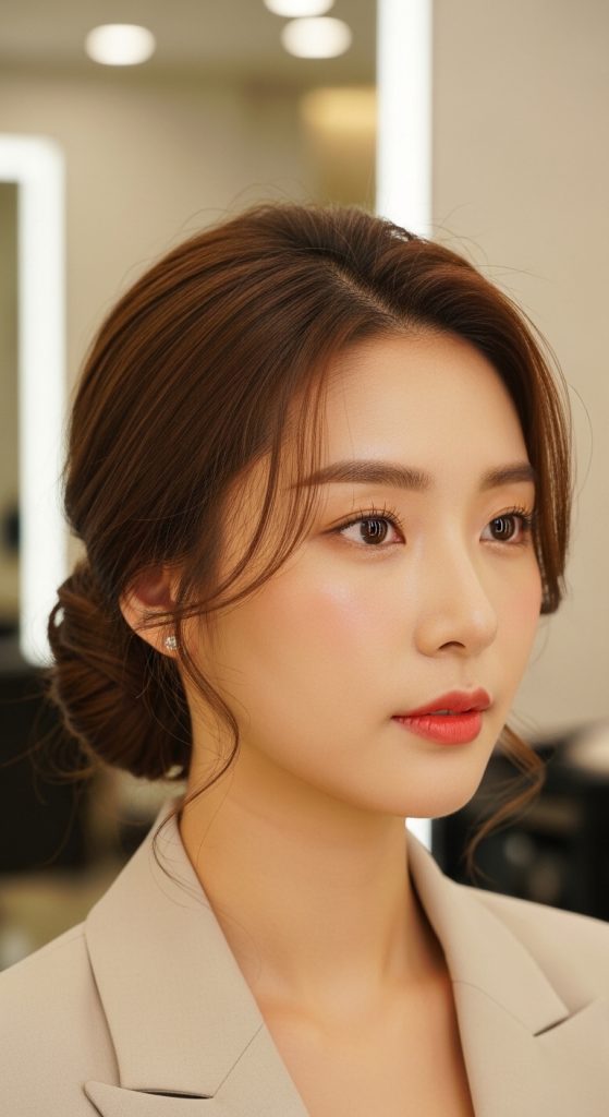 For graduates who prefer a more polished appearance, the elegant low bun is an excellent choice. Korean styling focuses on keeping the bun neat but slightly relaxed. A few soft strands are left around the face to create a natural and romantic effect. This hairstyle pairs beautifully with formal dresses and graduation gowns, giving a classy and refined look.