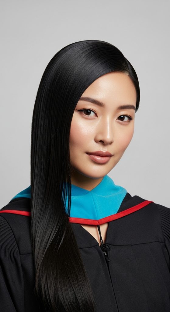 Minimalism is a key element in Korean beauty trends. Sleek, straight hair with a clean middle part creates a modern and confident appearance. This hairstyle works particularly well for graduates who prefer a sophisticated and effortless look. Using a shine serum or light hair oil helps keep the hair smooth and glossy throughout the party.