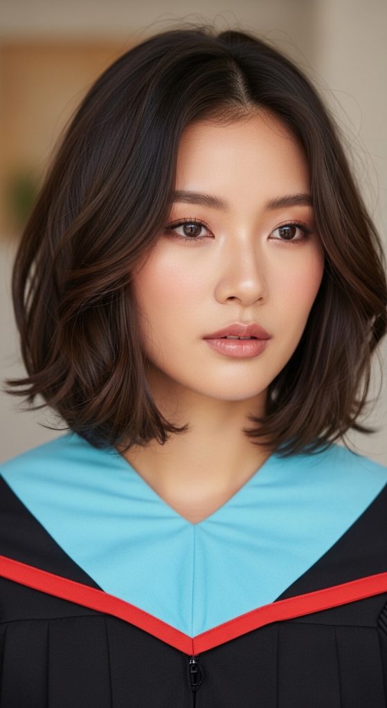 For those with shorter hair, a textured Korean bob is a trendy and stylish choice. This hairstyle often includes soft layers and gentle waves to create volume and movement. The slightly messy but controlled texture gives a fashionable appearance that feels both modern and playful. It’s a great option for graduates who want a bold yet elegant look.