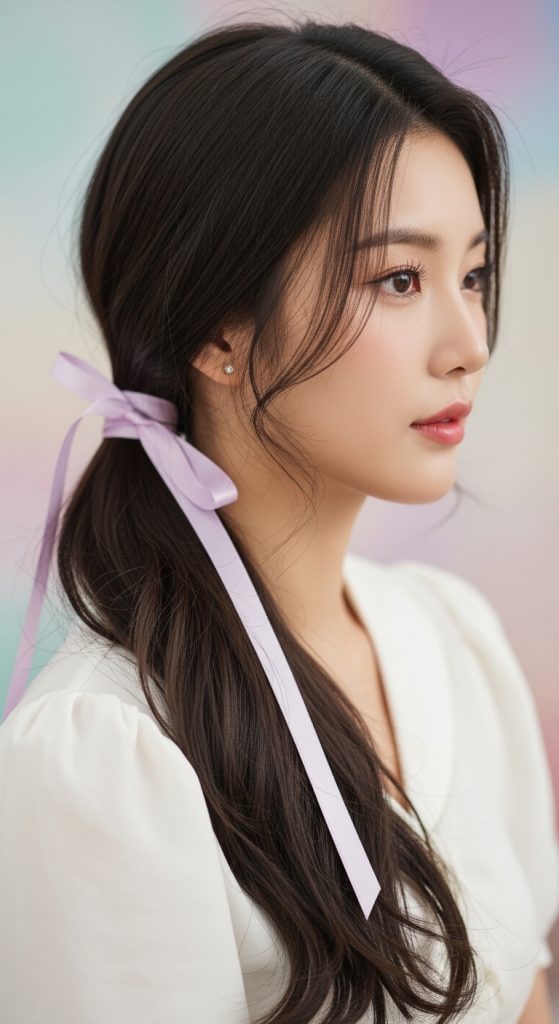 Accessories are an important part of Korean beauty styling. A ribbon-tied low ponytail is simple but incredibly charming. The hair is gathered loosely at the nape of the neck, and a soft ribbon is tied around the ponytail. The ribbon adds a feminine and celebratory element that fits perfectly with a graduation party atmosphere.