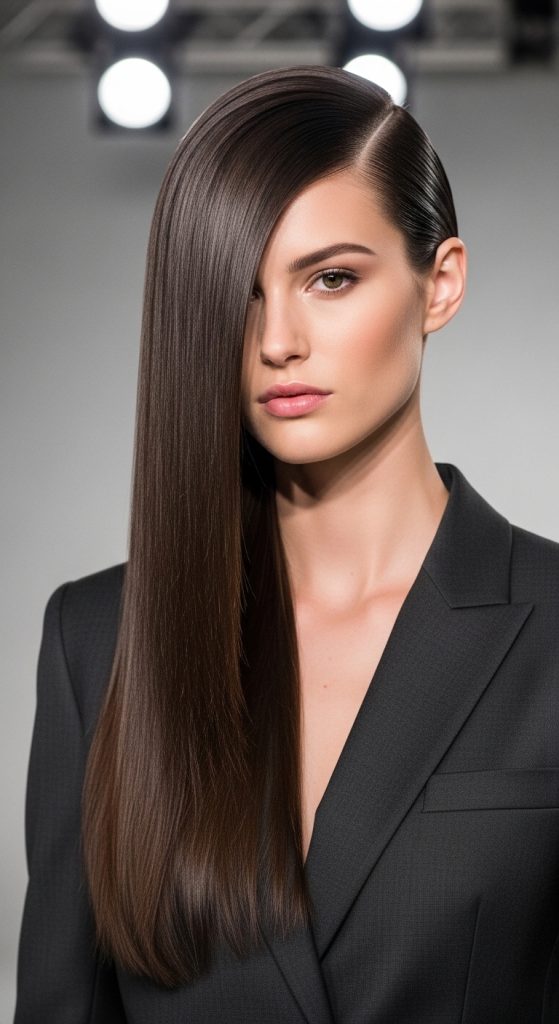 For a minimalist soft glam look, sleek straight hair with a deep side part is perfect. Straighten your hair for a glossy, polished finish, and create a dramatic side part to add structure. This style emphasizes facial features and gives a refined elegance, suitable for red carpet events or chic evenings out.