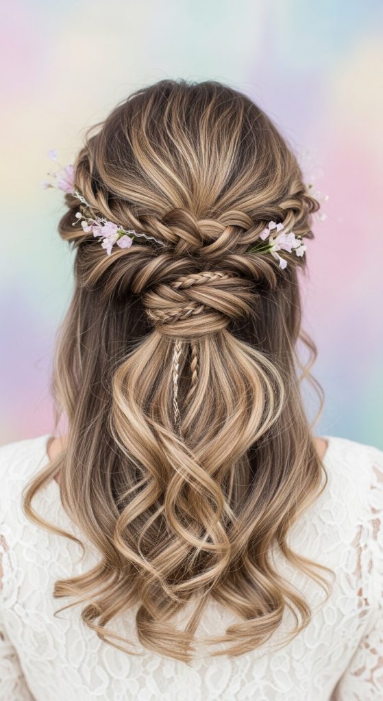 The half-up twisted crown is a versatile style that blends bohemian charm with polished glam. Partially pin back the top section of your hair, twisting small sections and securing them with bobby pins. The remaining hair can cascade in soft curls or waves. This hairstyle works well for medium to long hair and adds a whimsical yet refined touch.