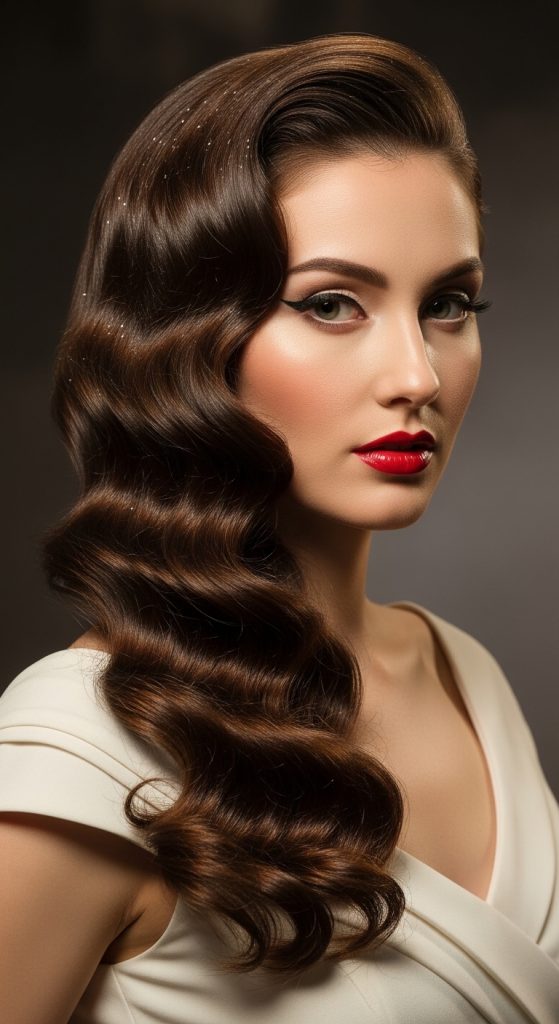 Side-swept curls create a glamorous old-Hollywood effect. Curl your hair in loose spirals, then sweep it to one side, securing with pins if needed. This asymmetrical style frames the face beautifully and highlights your neckline, making it perfect for formal dresses or strapless outfits.