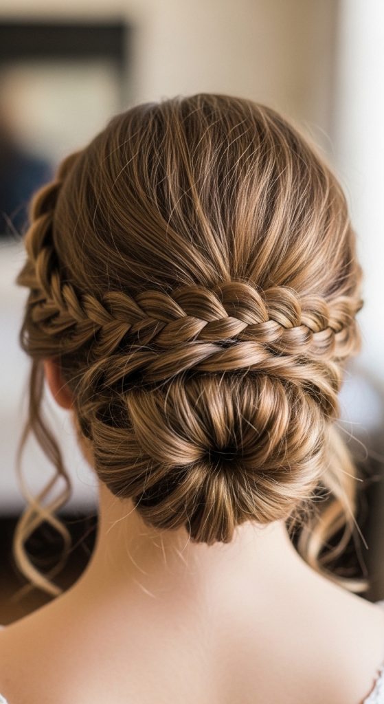 Braided updos combine intricate detailing with soft glam sophistication. You can create a loose, textured braid and wrap it into a bun, or try a braided crown that circles the head. These styles are ideal for weddings, proms, or any event where you want a polished yet romantic appearance. Finish with a light hairspray to maintain texture without stiffness.