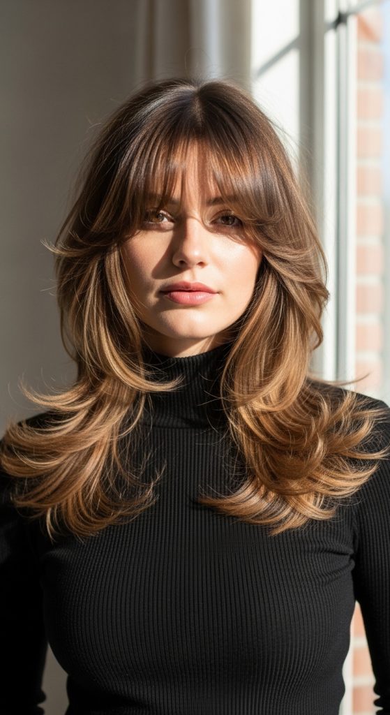 Layered hair with curtain bangs offers a modern take on soft glam. Layers add dimension and movement, while curtain bangs frame the face in a flattering way. Style with a round brush or flat iron to create subtle waves and volume. This versatile hairstyle works for medium to long hair and is ideal for both casual and sophisticated occasions.
