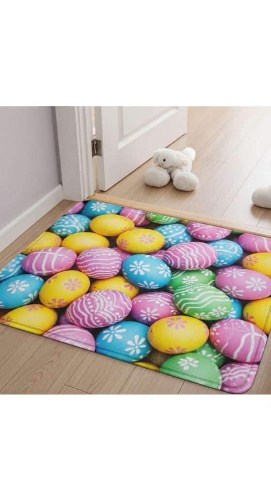 Celebrate one of Easter’s most beloved traditions by opting for a mat decorated with colorful Easter eggs. Mats featuring a scattered egg pattern, eggs in baskets, or even eggs forming a cheerful message like “Happy Easter” can be playful and engaging, especially for households with children who love hunting for eggs.