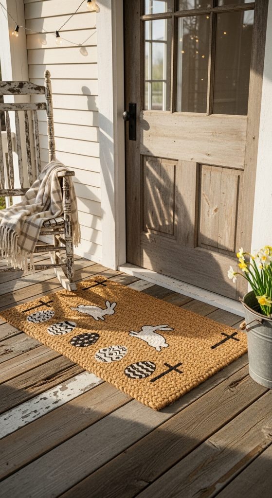 Add a playful touch with mats that feature bunny footprints leading to your door or across the hallway. This creative idea mimics the fun of an actual Easter bunny hopping around, creating a whimsical experience for visitors. You can even place multiple mats in sequence to create the illusion of a trail, leading children on a mini Easter adventure.