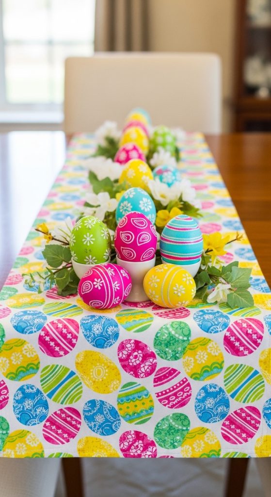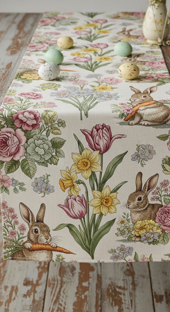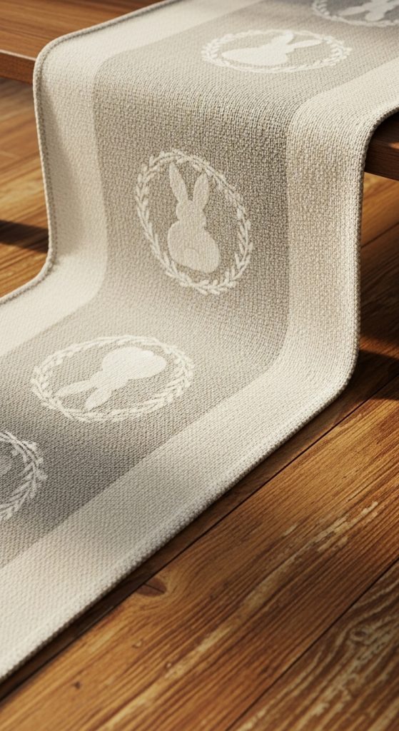 Nothing says Easter quite like bunnies. A runner featuring a trail of bunny footprints or silhouettes hopping across the fabric adds a playful touch. This design is especially appealing for families with children, as it brings a sense of fun and storytelling into the décor. Pair it with neutral surroundings so the bunny design becomes the focal point.