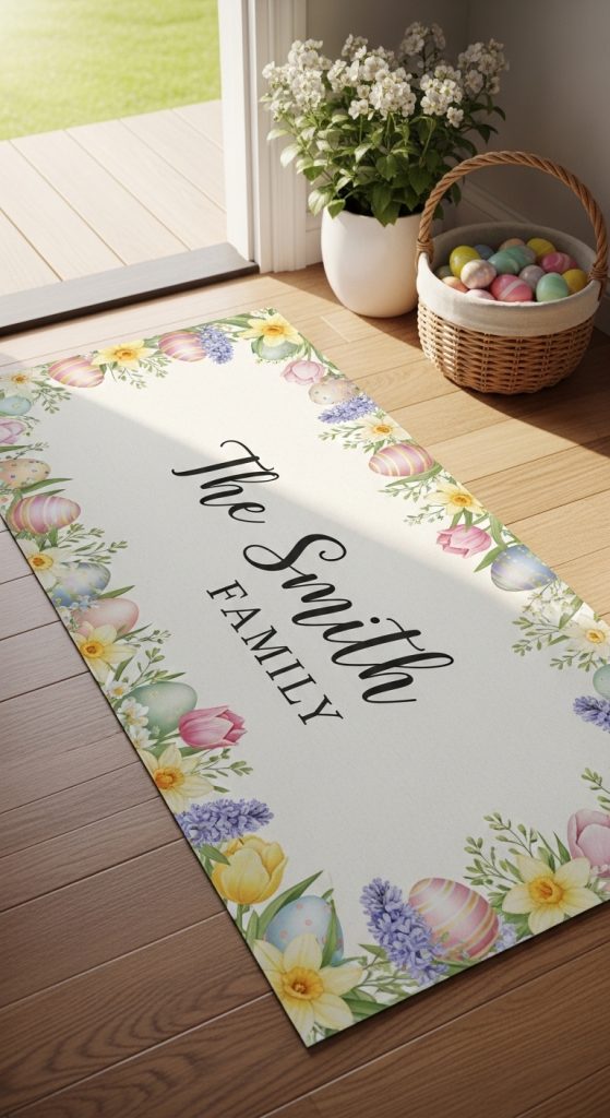 Customizing a floor runner with your family name, initials, or a festive Easter greeting can make your décor feel truly special. Add small decorative elements like eggs, bunnies, or floral borders to frame the personalization. This idea is perfect for entryways, as it warmly welcomes guests into your home.