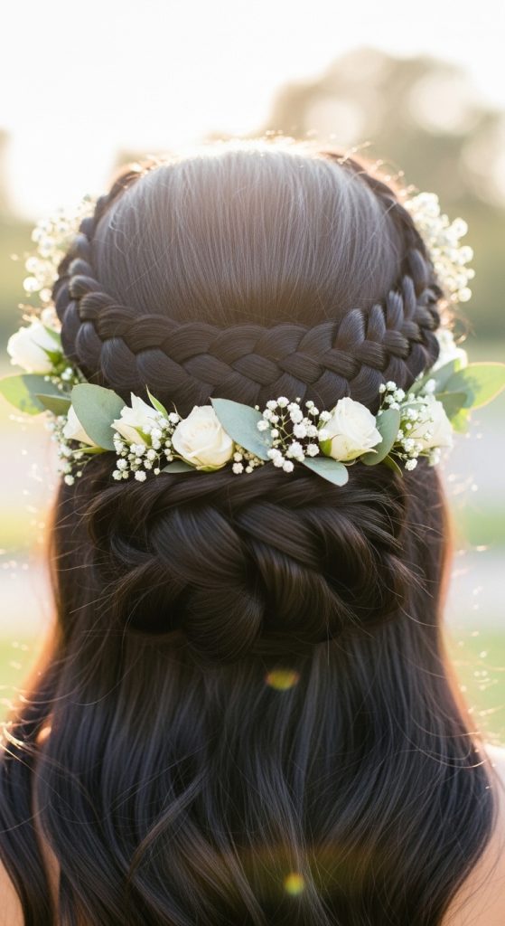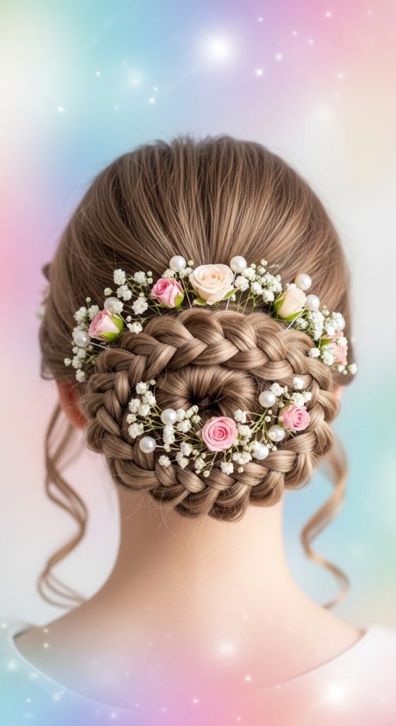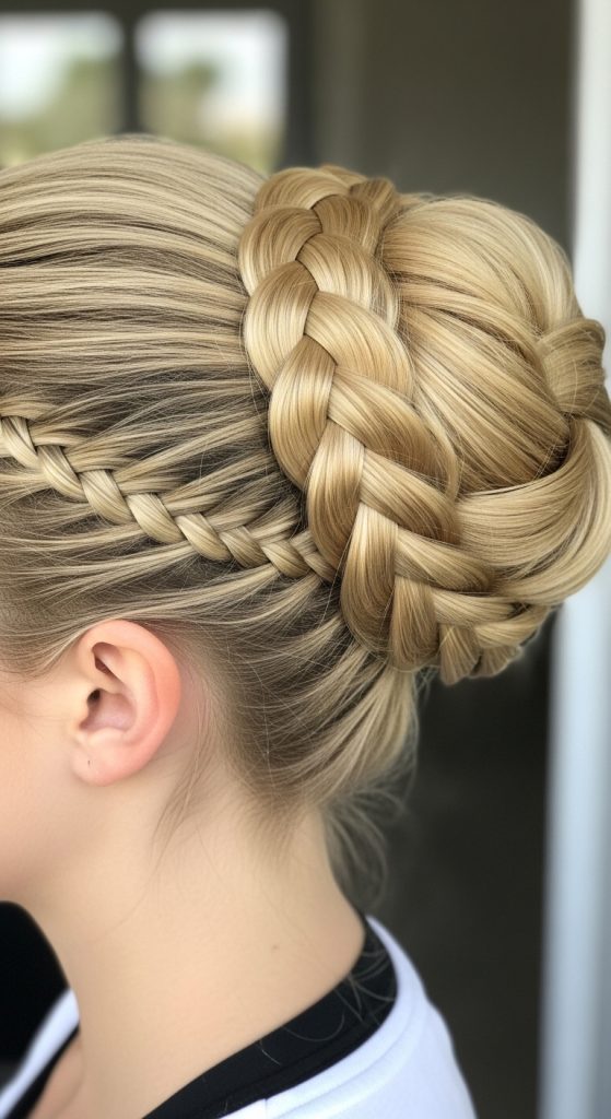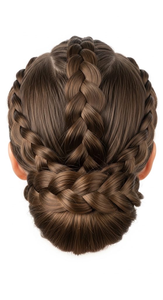 The crown braided bun features a braid that wraps around the head like a crown before being gathered into a bun at the back. This regal hairstyle is often chosen for weddings, proms, or formal celebrations. It highlights the face and gives a graceful, princess-like appearance while keeping hair neatly secured.