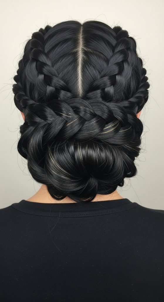 For a more intricate style, the double braided bun uses two braids instead of one. Hair is divided into two sections, each braided separately, and then both braids are wrapped together into a single bun. This creates a fuller and more textured bun, adding dimension and visual interest. It’s an excellent choice for festive occasions or parties.