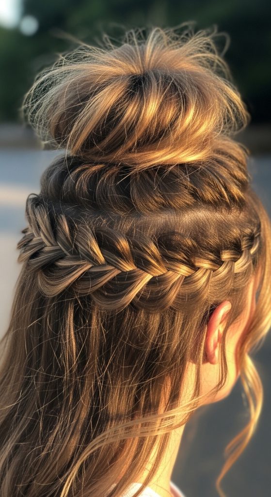The messy braided bun combines elegance with a relaxed, effortless vibe. Hair is loosely braided and then gathered into a bun with strands intentionally left out. This style works well for casual outings or bohemian-inspired looks. It gives the impression of a carefully undone hairstyle while still maintaining a chic appearance.