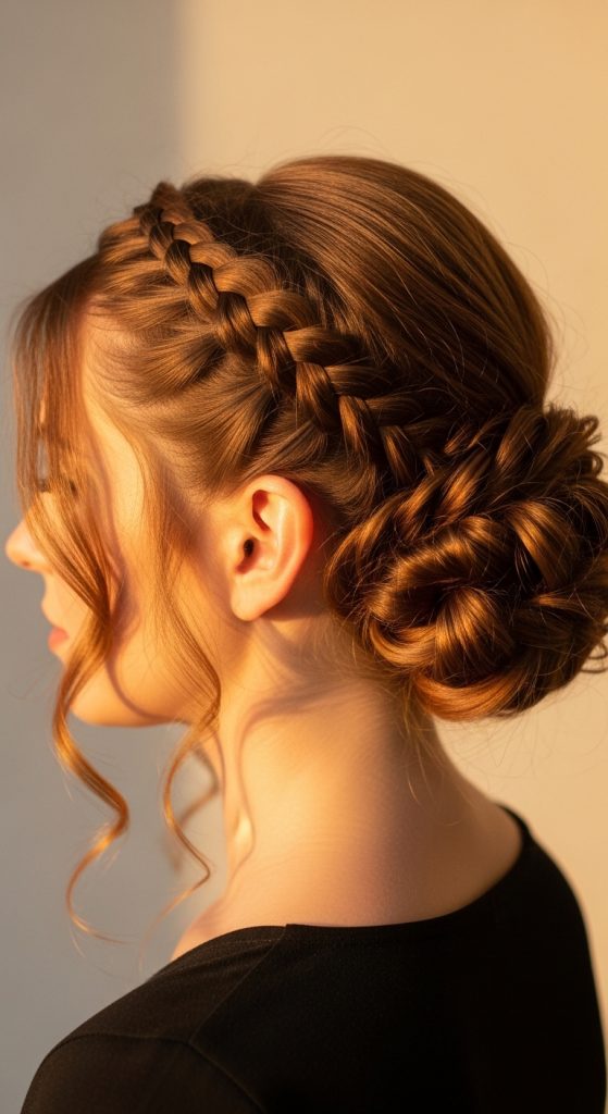 The side braided bun shifts the bun placement to one side of the head. A braid is created and then twisted into a bun positioned near the ear. This asymmetrical style adds a modern twist to the traditional bun and is especially flattering when paired with side-swept bangs or soft curls framing the face.