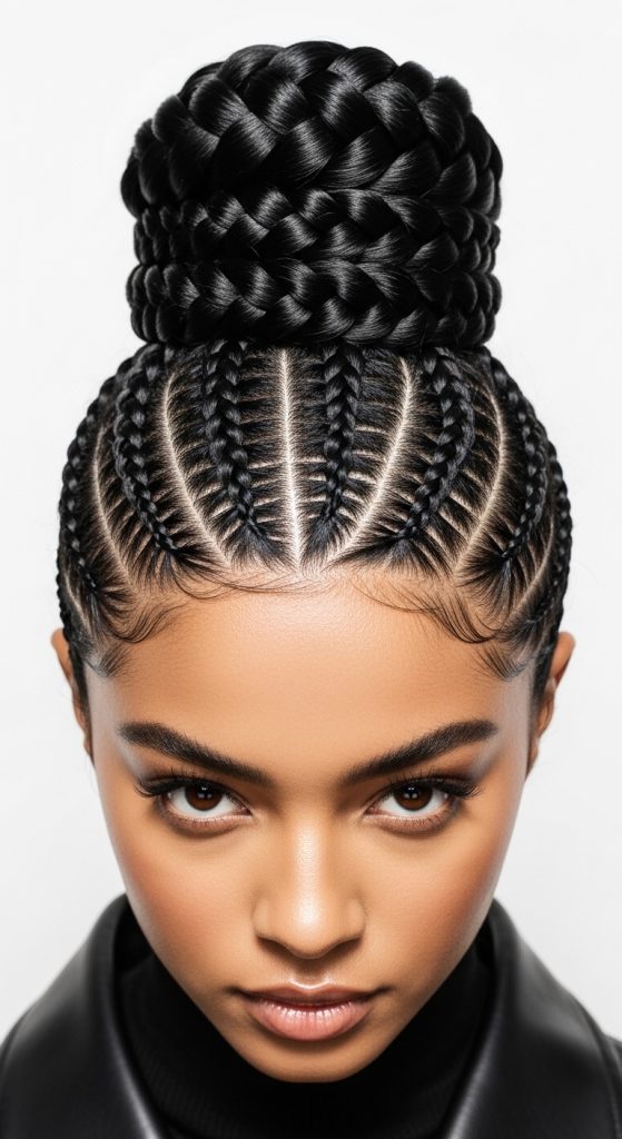 The high braided bun is positioned at the top of the head, giving a lifted and voluminous appearance. Hair is braided and then coiled into a bun at the crown. This style elongates the neck and creates a bold silhouette. It is a popular choice for formal events, performances, or fashion-forward looks.