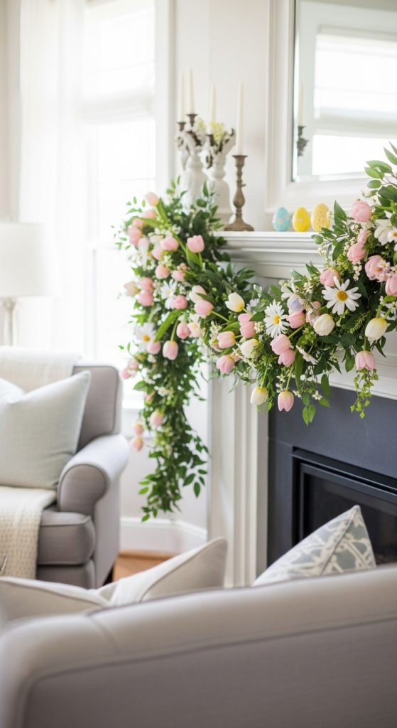 Fresh or artificial flowers are a timeless choice for Easter décor. A floral garland made with pastel-colored blooms such as tulips, daisies, and peonies can instantly bring a soft, springtime feel to any room. You can mix greenery like eucalyptus or ivy to add depth and contrast. This type of garland works beautifully over fireplaces or along stair rails.