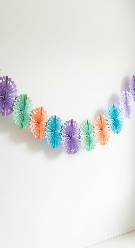 Paper fan garlands are easy to make and visually striking. Using pastel or patterned paper, fold and assemble fans of different sizes and attach them along a string. Mixing colors like lavender, mint, peach, and baby blue can create a vibrant spring palette. This idea is budget-friendly and perfect for indoor parties or wall decorations.