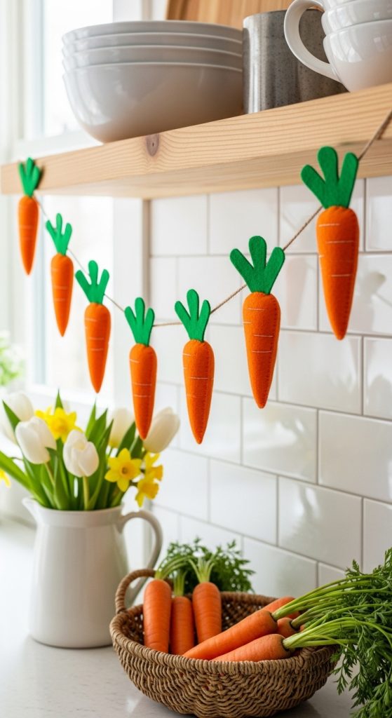 A fun and unique idea is a carrot-themed garland. You can craft small carrot shapes using orange and green felt or paper. Arrange them along a string, spacing them evenly. This garland works especially well in kitchen areas or dining rooms, adding a playful Easter farm-inspired theme.