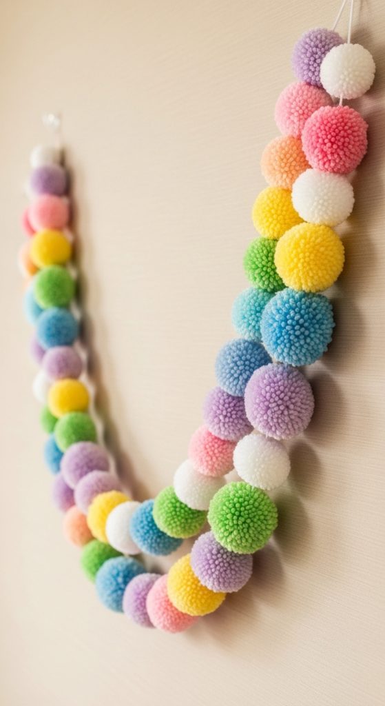 Pom-pom garlands are soft, colorful, and fun. You can either make your own pom-poms using yarn or purchase pre-made ones. Choose pastel tones to match Easter themes or go for a rainbow effect. String them together using a needle and thread for a lightweight and playful decoration suitable for walls, windows, or party setups.