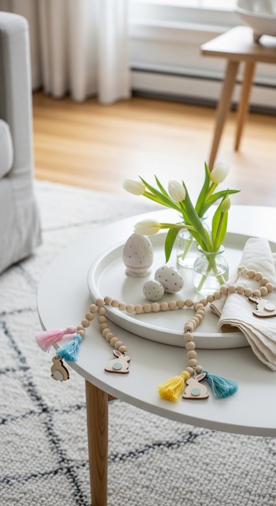 Wooden bead garlands offer a minimalist and elegant approach. To give them an Easter twist, you can add small painted eggs, bunny charms, or pastel tassels. This style blends well with modern, farmhouse, or Scandinavian-inspired interiors and can be reused for other seasonal décor.