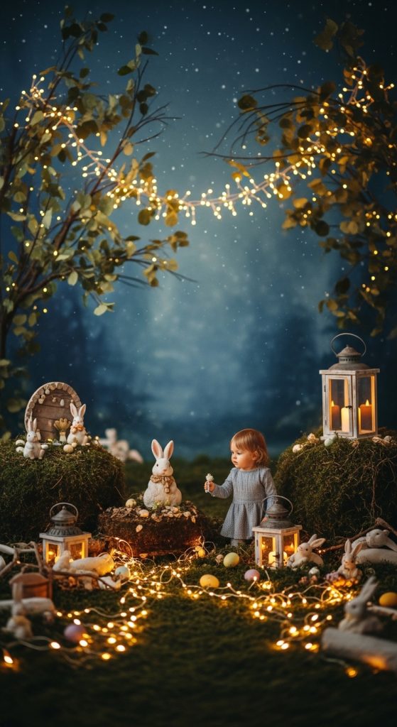 Create a narrative-driven session by designing a storybook-style Easter scene. This could include a small staged environment such as a bunny’s home, a magical forest corner, or a whimsical egg village. Use props like books, miniature doors, fairy lights, and themed decorations to create a fantasy-like atmosphere. This idea is perfect for imaginative and artistic photography.