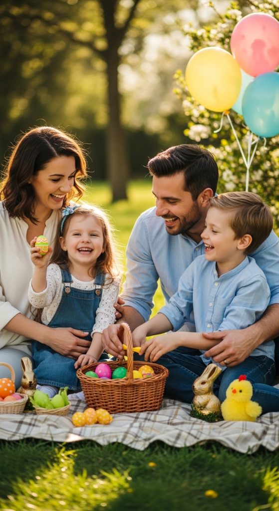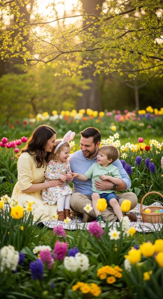 A picnic-themed session brings a relaxed and candid atmosphere. Set up a picnic blanket, baskets, snacks, and Easter eggs in a park or garden. Encourage families to interact naturally—sharing food, playing games, or simply relaxing together. This setup works well for capturing emotional connections and genuine family moments.