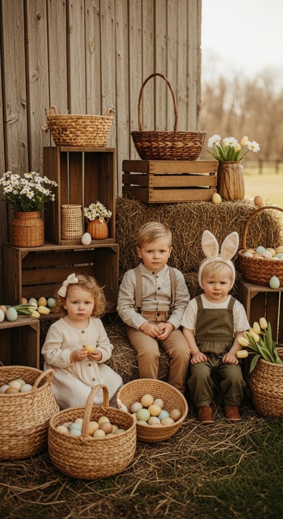 A rustic Easter setup can include wooden crates, hay bales, vintage baskets, and neutral-toned fabrics. This theme works well for outdoor farm locations or styled studio setups. Adding elements like chickens, faux eggs, or wooden signage can enhance the country-style Easter vibe. This idea is especially appealing for families seeking a more earthy aesthetic.