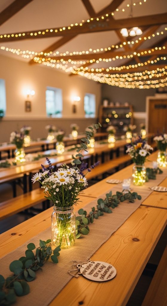 For a warm and cozy atmosphere, go for a rustic theme. Use wooden décor, mason jars, fairy lights, and soft neutral colors. This setup works beautifully in a hall with natural elements or outdoor access. Add a dessert table with homemade treats for a charming touch.