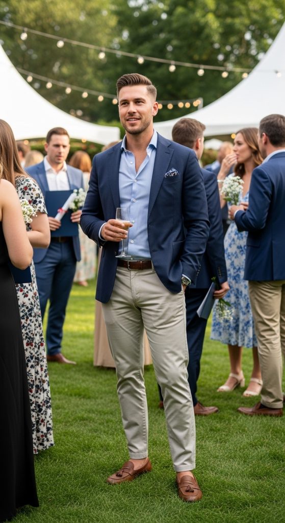 For a semi-formal look, combine a tailored blazer with chinos. Choose contrasting colors such as a navy blazer with beige or khaki chinos. Add a button-down shirt underneath and finish with loafers or dress shoes. This outfit strikes the perfect balance between formal and relaxed.
