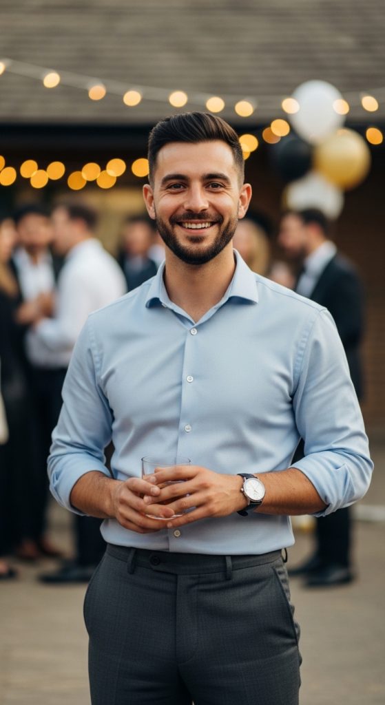 A dress shirt paired with a vest adds a touch of refinement without the need for a full suit jacket. This layered look is stylish and works well for indoor celebrations. Choose a contrasting vest to make the outfit stand out, or stick to matching tones for a more cohesive appearance.