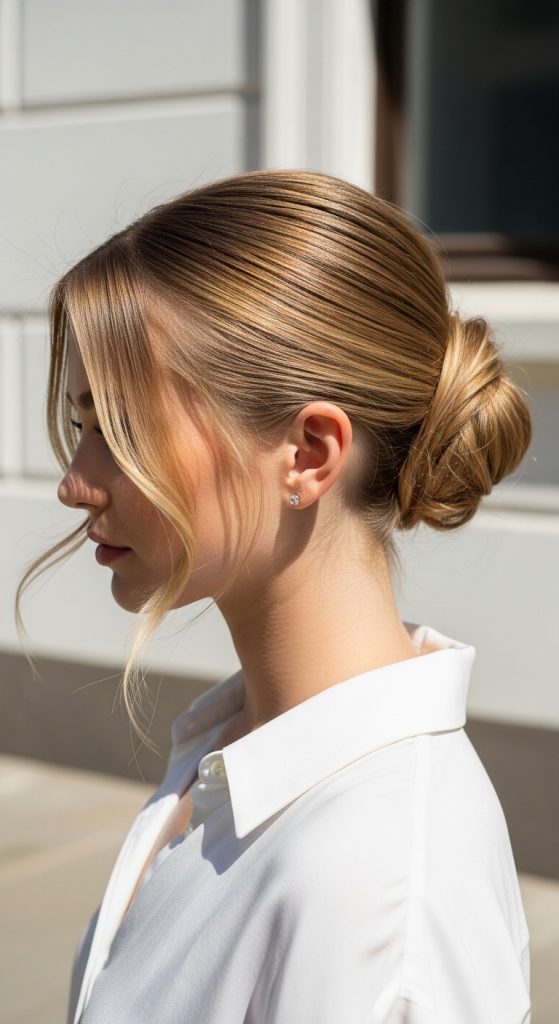 This style combines the neatness of a sleek bun with a slightly relaxed finish. The hair is smoothed at the roots while the bun itself has a soft, undone texture. It’s perfect for those who want a balance between elegance and effortless charm.