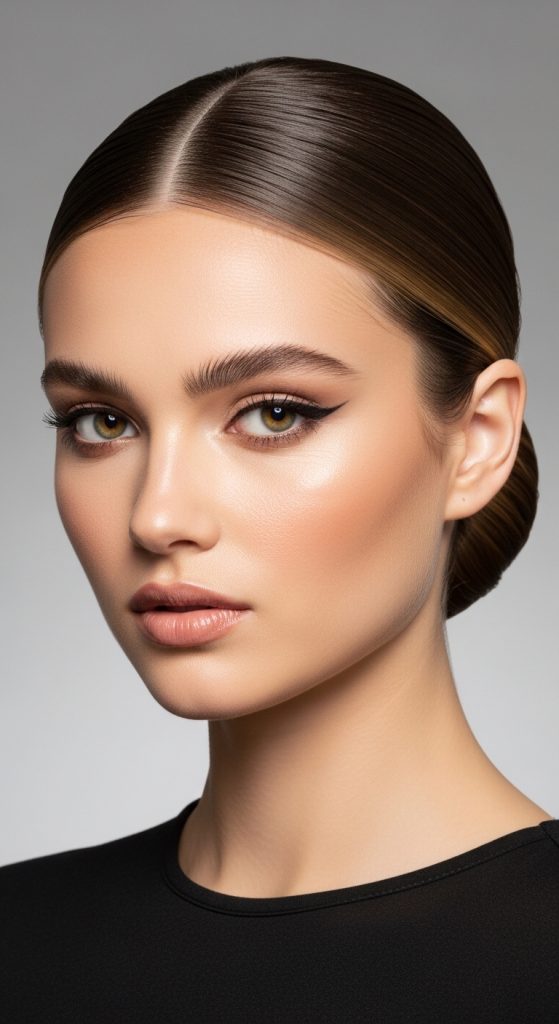 This hairstyle features a sharp middle part before gathering the hair into a sleek bun. The middle part adds symmetry and structure, giving a modern and fashion-forward vibe. It works beautifully for both low and mid-level buns and complements oval and heart-shaped faces particularly well.
