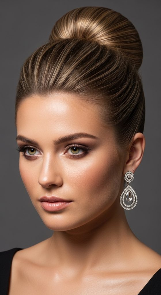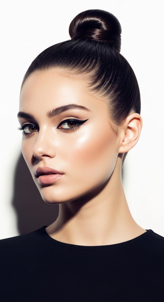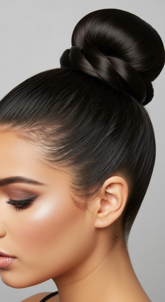 A high sleek bun is placed at the crown of the head, giving an instant lift to your overall look. It creates a clean silhouette and elongates the neck, making it ideal for both casual chic and elegant occasions. This style works especially well when paired with bold makeup or statement accessories.