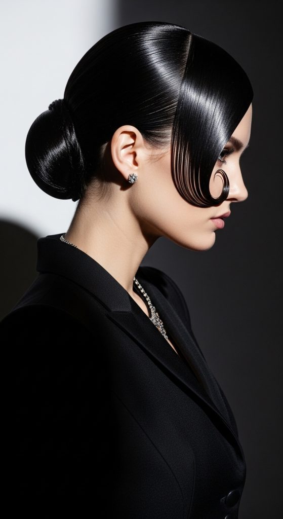 A side part adds asymmetry and sophistication to a sleek bun. The deep side part enhances facial features and gives a more dramatic and polished appearance. This variation is perfect for formal events or evening wear when you want a refined yet stylish look.