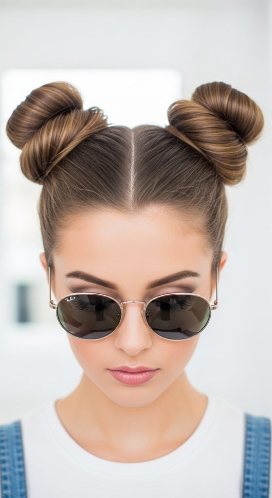For a playful yet sleek appearance, double buns positioned on either side of the head offer a unique twist. While often associated with casual styles, keeping them sleek and tightly styled gives a more polished and fashion-forward interpretation of space buns.