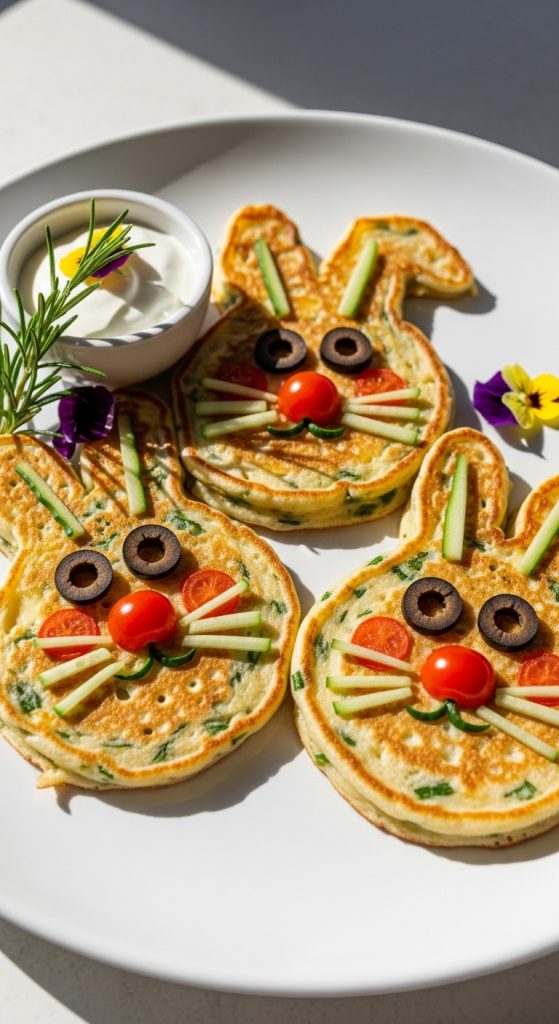 Not all pancakes have to be sweet. Create a savory version using ingredients like cheese, eggs, and herbs. Shape the pancakes into a bunny and use vegetables like olives, cherry tomatoes, and cucumbers for decoration. This is a great option for those who prefer a less sugary breakfast.