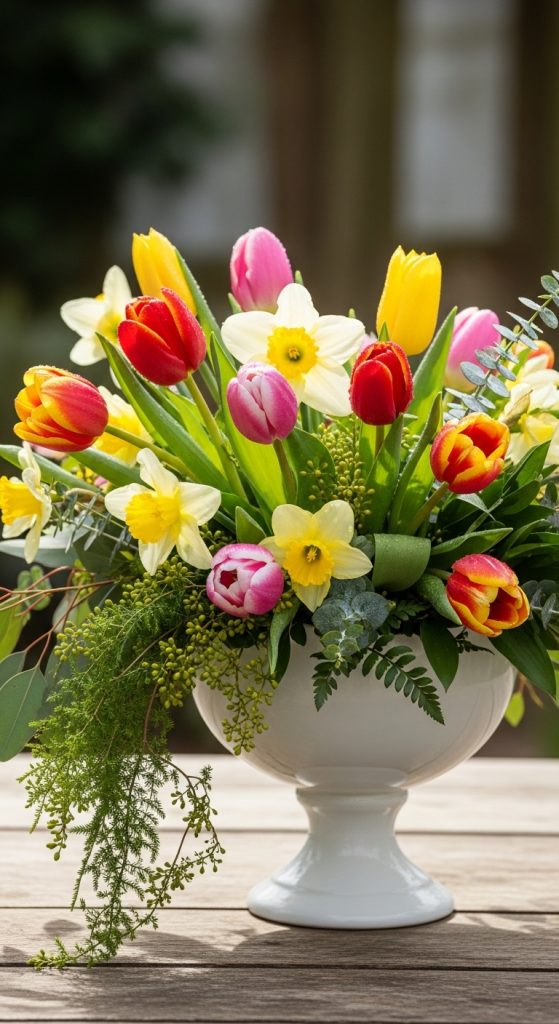 Nothing captures the spirit of Easter quite like fresh flowers. Fill your pedestal bowl with seasonal blooms such as tulips, daffodils, hyacinths, or ranunculus. Choose a cohesive color palette or mix vibrant shades for a cheerful display.