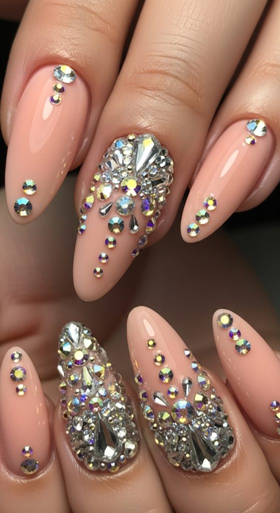 For those who love bold and glamorous nails, adding rhinestones to a peach base can elevate your look instantly. Whether you choose a single accent nail or decorate multiple nails, rhinestones add sparkle and sophistication. This design is perfect for parties, weddings, or any event where you want to shine.