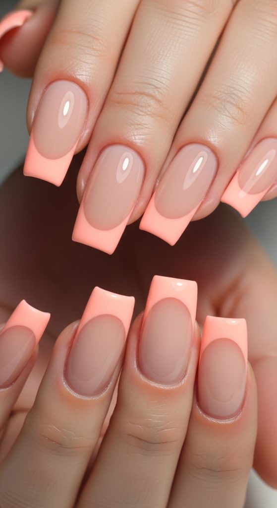 Give the traditional French manicure a refreshing twist by replacing the white tips with peach. You can keep the base nude or light pink for a subtle contrast. This design is ideal if you want something elegant yet slightly different from the norm. It’s perfect for weddings, office wear, or everyday sophistication.