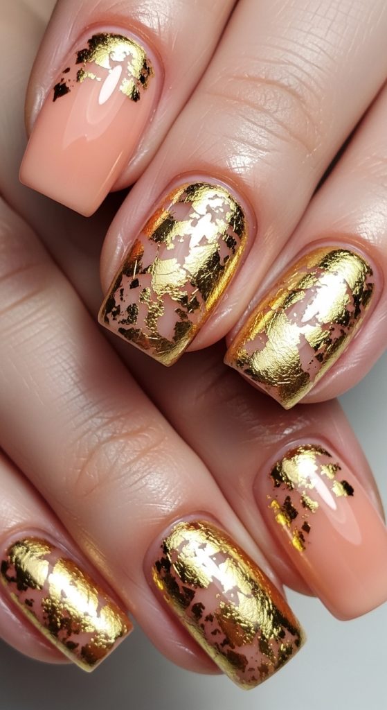 For a touch of luxury, pair peach nails with gold foil accents. The metallic shimmer contrasts beautifully with the soft peach base, creating a glamorous effect. You can apply gold foil randomly or focus it on accent nails for a balanced design. This look is especially stunning for special occasions or festive seasons.