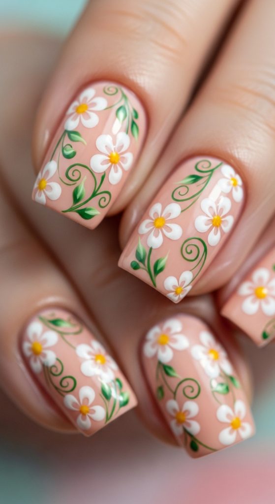 Floral designs and peach tones are a match made in heaven. Adding small flowers in white, yellow, or even darker peach shades can create a fresh and romantic vibe. This design is ideal for spring and summer, giving your nails a soft, nature-inspired look.