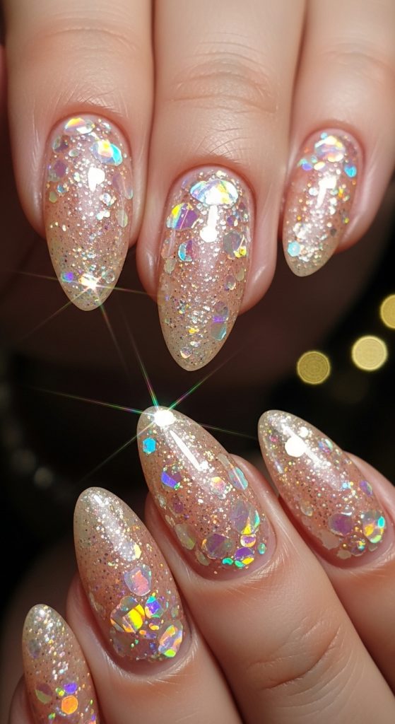 If you love a bit of sparkle, peach glitter nails are the way to go. You can opt for a full glitter nail or add glitter accents to a peach base. This design catches the light beautifully and adds a playful yet elegant touch to your manicure.